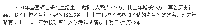2021年全國碩士研究生招生考試報考人數(shù)為377萬,比去年增長36萬,再創(chuàng)歷史新高。報考我??忌?cè)藬?shù)為12215名,其中在我校考點(diǎn)參加考試的考生為2585名,比去年略有減少。2021年我校研究生入學(xué)考試成績預(yù)計(jì)明年2月底公布。