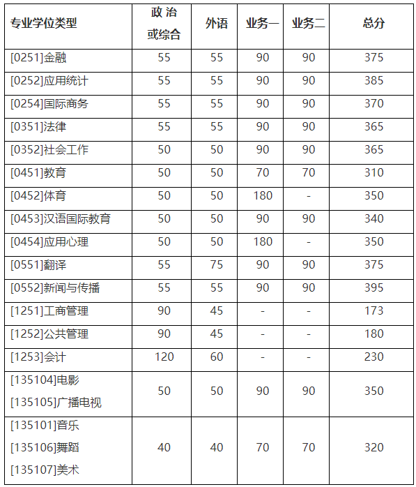 二、學(xué)校復(fù)試基本分?jǐn)?shù)線(專業(yè)學(xué)位類)