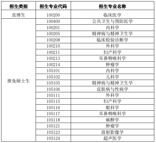 我院全日制碩士部分招生專業(yè)接收推免生,臨床醫(yī)學(xué)一級(jí)學(xué)科博士點(diǎn)可接收 優(yōu)秀應(yīng)屆本科畢業(yè)生直接攻讀博士學(xué)位研究生(以下簡(jiǎn)稱“直博生”)。具體招 生專業(yè)詳見下表。實(shí)際接收推免生人數(shù)以最后推免服務(wù)系統(tǒng)確認(rèn)的錄取人數(shù)為 準(zhǔn)。
