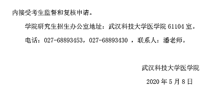 以上是醫(yī)學(xué)教育網(wǎng)小編整理的“武漢科技大學(xué)醫(yī)學(xué)院2020碩士研究生復(fù)試工作公告”全部內(nèi)容,想了解更多醫(yī)學(xué)考研知識及內(nèi)容,請點擊醫(yī)學(xué)教育網(wǎng)。