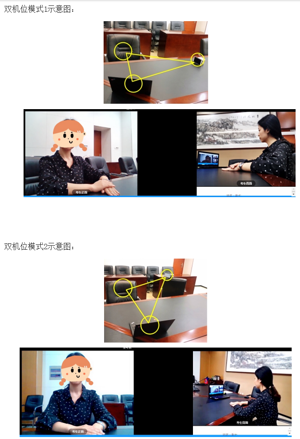 雙機位操作:考生雙手擺放桌面,第一機位從正面拍攝,須完整拍攝到考生雙手以上身體部位。第二機位從考生側方(或側后方)拍攝,可以拍攝到考生側面及主設備電腦全屏幕,需保證面試考官能夠從第二機位清晰看到第一機位屏幕。