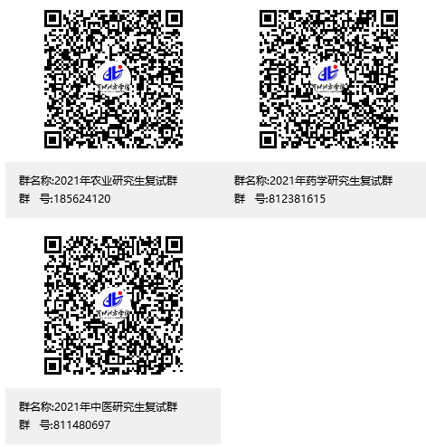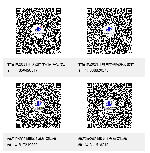 河北北方學院2021年一志愿考生復試工作計劃于3月27日-3月30日進行。為加強我校2021年復試管理及復試通知精準推送,現(xiàn)建立我校研究生復試群,按專業(yè)類別分為教育研究生復試群、農(nóng)業(yè)研究生復試群、基礎醫(yī)學研究生復試群、學術型臨床醫(yī)學復試群、藥學研究生復試群、臨床專碩復試群和中醫(yī)復試群,請大家按照報考的專業(yè)掃碼進入相應群。后期我校相關復試工作具體安排將通過QQ群以及研究生學院官網(wǎng)同時發(fā)送。