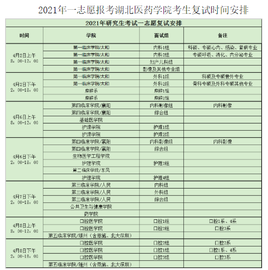 根據(jù)《湖北醫(yī)藥學(xué)院2021年碩士研究生復(fù)試工作方案》,為嚴(yán)格落實(shí)疫情防控工作要求,遵循錯(cuò)時(shí)錯(cuò)峰工作 要求,各學(xué)院或?qū)W科分時(shí)、分批有序安排。