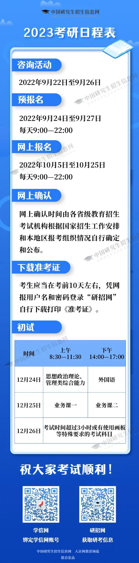 2023年考研時(shí)間已定!中國研究生招生信息網(wǎng)發(fā)布2023考研日程表,考研時(shí)間確定為12月24日-26日!具體內(nèi)容如下: