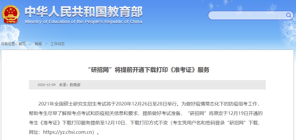 為做好疫情防護(hù)工作,將原定于12月19日開(kāi)通的考生《準(zhǔn)考證》打印下載服務(wù)提前至12月10日。