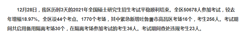 2021年碩士研究生招生考試已經(jīng)于2020年12月28日順利結(jié)束,新疆招生網(wǎng)發(fā)布了“新疆2021年全國碩士研究生招生考試工作平穩(wěn)順利結(jié)束”,其中涉及了新疆維吾爾自治區(qū)2021年考研的報考人數(shù),為了幫助各位21與22考研的考生了解,醫(yī)學教育網(wǎng)小編整理新聞內(nèi)容如下!