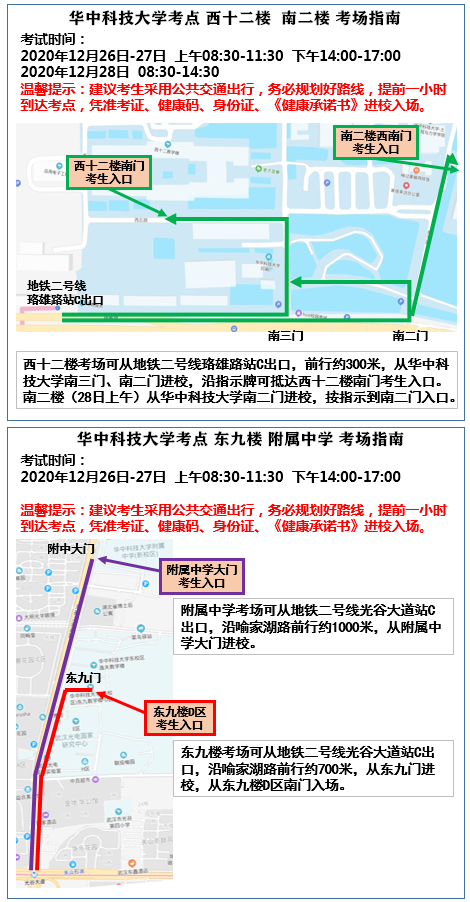 結(jié)合我校考點(diǎn)考務(wù)工作和校園疫情防控工作安排,校外考生報(bào)考我校的考場(chǎng),集中安排在西十二樓、東九樓D區(qū)及華中科技大學(xué)附屬中學(xué)(新校區(qū))。
