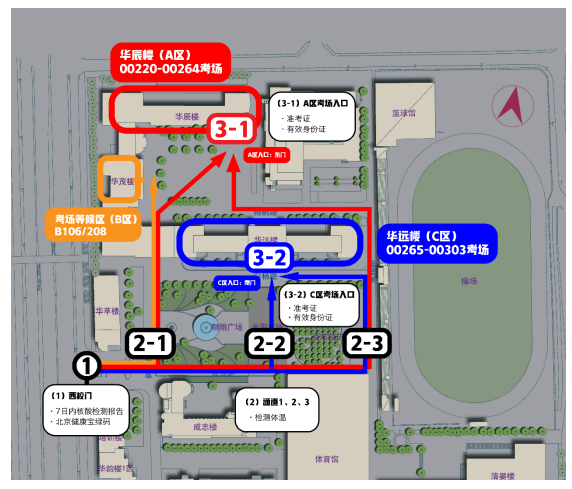 (3)A 區(qū)考生在圖示 3-1 處 A 區(qū)考場(chǎng)入口、C 區(qū)考生在圖示 3-2 處 C 區(qū)考場(chǎng)入口出示準(zhǔn)考證和有效身份證。 相關(guān)材料攜帶不全或無(wú)法確認(rèn)身份真實(shí)性的考生不得進(jìn)入。入 場(chǎng)后在考試結(jié)束之前不允許離開(kāi)考場(chǎng)。考試期間,各考場(chǎng)樓禁止 其他人員入內(nèi)。 考生(包括清華大學(xué)校內(nèi)和清華附中考試的考生)進(jìn)入考場(chǎng) 前須佩戴口罩,聽(tīng)從考試工作人員指揮,配合完成體溫測(cè)量等健 康檢查,排隊(duì)過(guò)程中請(qǐng)保持間距。進(jìn)入校園后,請(qǐng)按路線圖和指 示標(biāo)志直接前往考場(chǎng)樓,不要在其他區(qū)域活動(dòng)或逗留,以免錯(cuò)過(guò) 入場(chǎng)時(shí)間。