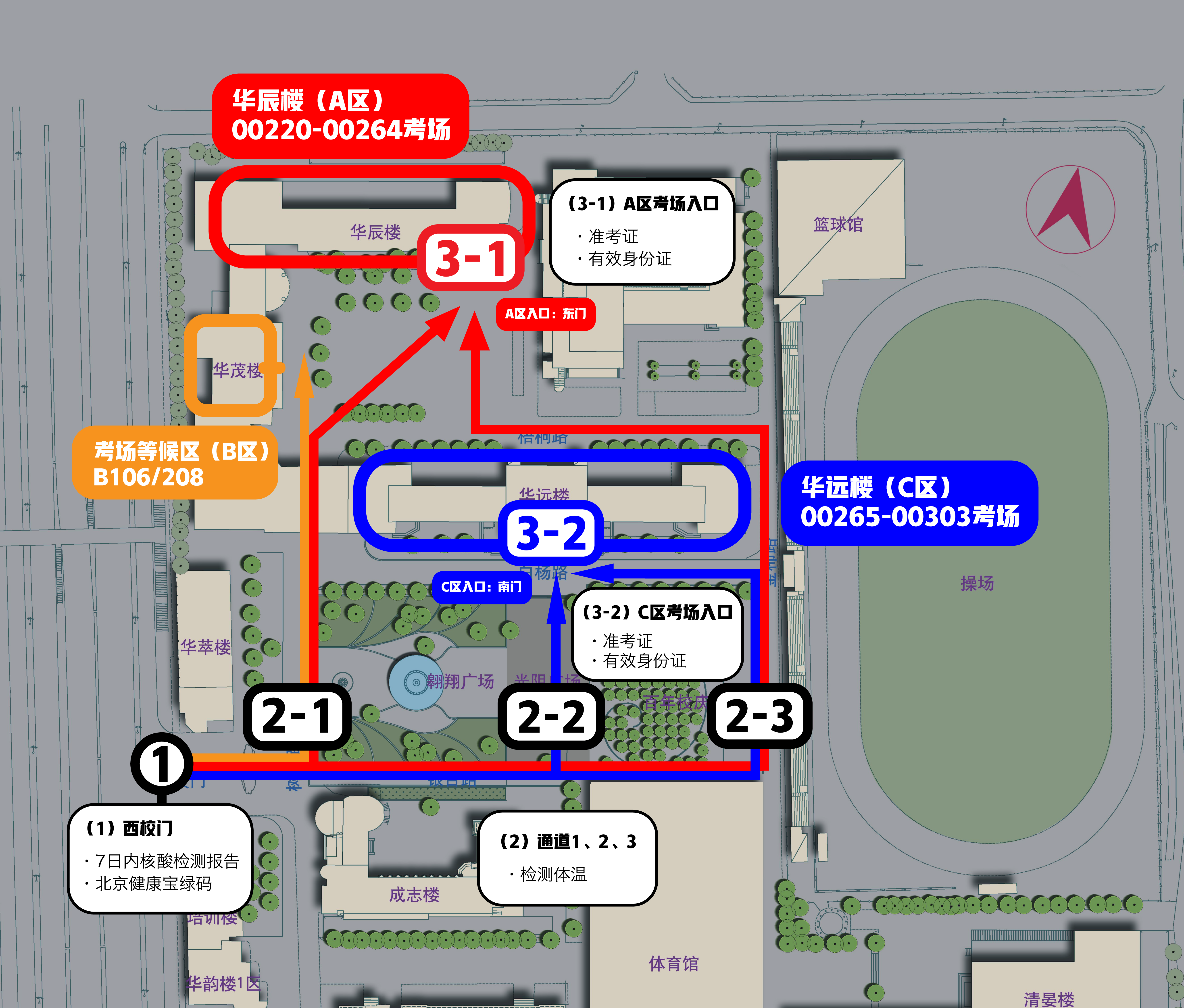 2.考試地點(diǎn)在清華附中的考生: 只能從指定的唯一入校通道——清華附中西校門(臨近中關(guān) 村北大街和清華附中公交站)進(jìn)入。附中西校門將于考試當(dāng)天 26 日早晨 7:00 開(kāi)啟。考生結(jié)束上午考試后可離校就餐,下午西校 門開(kāi)啟時(shí)間為 12:30。 華辰樓(A 區(qū))考場(chǎng)入口為該樓的東門,華遠(yuǎn)樓(C 區(qū))考 場(chǎng)入口為該樓的南門。華辰樓和華遠(yuǎn)樓的樓門開(kāi)放時(shí)間為上午 7:50,下午 13:30。為避免擁堵,入場(chǎng)將采用分段檢測(cè),示意圖 如下