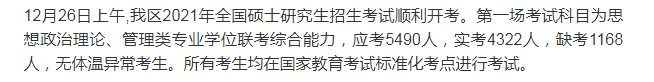 12月26日上午,我區(qū)2021年全國碩士研究生招生考試順利開考。應(yīng)考5490人,實考4322人,缺考1168人,無體溫異??忌?。