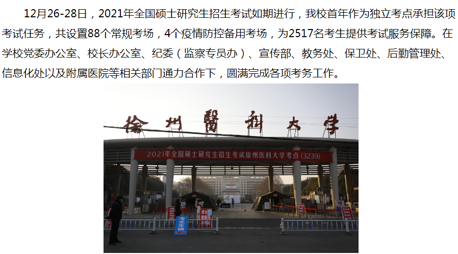 2021年碩士研究生招生考試已經(jīng)于2020年12月28日順利結(jié)束,徐州醫(yī)科大學(xué)研究生院發(fā)布了“徐州醫(yī)科大學(xué)考點(diǎn)順利完成2021年碩士研究生招生考試”,其中涉及了徐州醫(yī)科大學(xué)的2021年考研的報(bào)考人數(shù),為了幫助各位21年與22年考研的考生了解,醫(yī)學(xué)教育網(wǎng)小編整理新聞內(nèi)容如下!