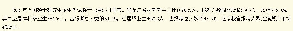 2021年全國碩士研究生招生考試將于12月26日開考。黑龍江省報(bào)考考生共計(jì)107689人,報(bào)考人數(shù)同比增長8563人,增幅為8.6%,其中應(yīng)屆本科畢業(yè)生58476人,占報(bào)考總?cè)藬?shù)的54.3%,往屆畢業(yè)生49213人,占報(bào)考總?cè)藬?shù)的45.7%。這是我省報(bào)考人數(shù)連續(xù)第六年持續(xù)增長。