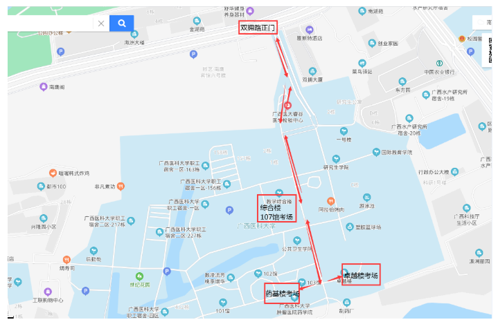 (一)根據(jù)疫情防控管理要求,我?,F(xiàn)實(shí)行封閉式管理,考試期間禁止考生的任何車(chē)輛進(jìn)入校園,所有考生必須步行沿考生專用通道,憑準(zhǔn)考證及廣西健康綠碼進(jìn)入我校考點(diǎn)參加考試,具體詳見(jiàn)考場(chǎng)路線圖: