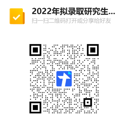 因部分考生反映本人手機號碼、收件地址等信息發(fā)生變更,為不影響后續(xù)收取調(diào)檔函及錄取通知書,請需要修改手機號碼、檔案所在單位名稱和錄取通知書收件地址的考生統(tǒng)一于5月12日之前使用微信掃描如下二維碼自行修改并提交(請勿重復提交)。初試報名時填寫信息不變的考生無需提交。