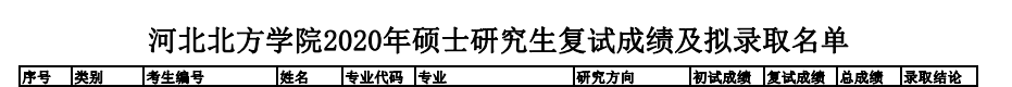 河北北方學院2020年碩士研究生擬錄取名單與復試成績已經(jīng)公布,請各位報考了河北北方學院的考生們及時查看。,名單如下。請各位報考了河北北方學院的考生盡快進行查看。