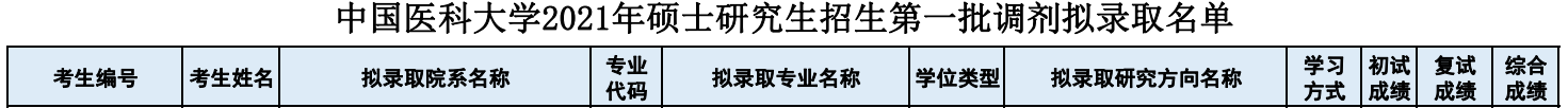 根據(jù)《中國(guó)醫(yī)科大學(xué)2021年碩士研究生招生復(fù)試錄取方案》,現(xiàn)對(duì)我校2021年碩士研究生招生第一批調(diào)劑擬錄取名單進(jìn)行公示,如對(duì)名單有不同意見,可撥打電話024-31939465聯(lián)系工作人員,聯(lián)系人:陳老師、李老師。