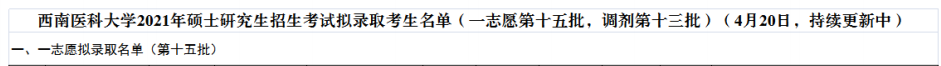 為幫助各位考生及時了解錄取結(jié)果,醫(yī)學(xué)教育網(wǎng)小編在西南醫(yī)科大學(xué)研究生院的官網(wǎng)上查找到了“西南醫(yī)科大學(xué)2021年碩士研究生招生考試擬錄取考生名單(一志愿第十五批,調(diào)劑第十三批)”通知內(nèi)容如下,請同學(xué)仔細(xì)查看!有問題請及時聯(lián)系學(xué)校!