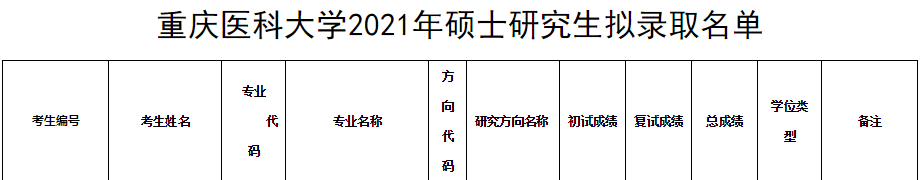 我校2021年碩士研究生擬錄取工作已經(jīng)順利結(jié)束,現(xiàn)將擬錄取研究生名單予以公示(此名單不含已錄取的推免生和長(zhǎng)學(xué)制考生)。公示時(shí)間為10個(gè)工作日。如對(duì)公示研究生有情況反映,請(qǐng)以電話或書(shū)面形式向中共重慶醫(yī)科大學(xué)紀(jì)委或重慶醫(yī)科大學(xué)研究生招生辦公室反映。反映人須用真實(shí)姓名,所述情況實(shí)事求是。