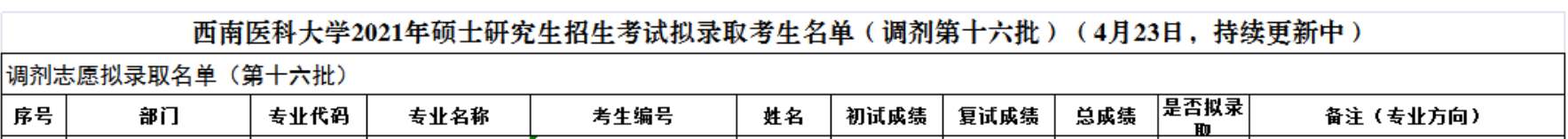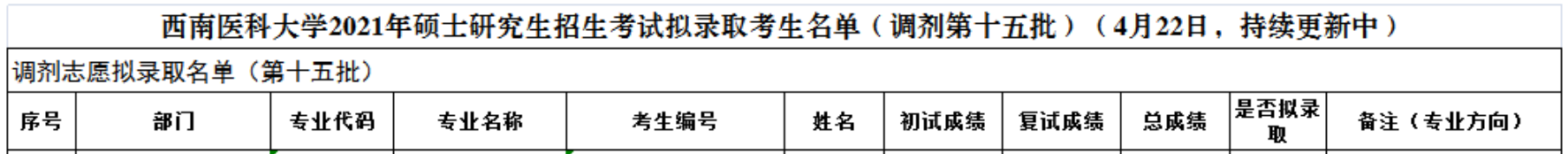 為幫助各位考生及時了解錄取結(jié)果,醫(yī)學(xué)教育網(wǎng)小編在西南醫(yī)科大學(xué)研究生院的官網(wǎng)上查找到了“西南醫(yī)科大學(xué)2021年碩士研究生招生考試擬錄取考生名單(調(diào)劑第十五批)(4月22日,持續(xù)更新中)”通知內(nèi)容如下,請同學(xué)仔細查看!有問題請及時聯(lián)系學(xué)校!