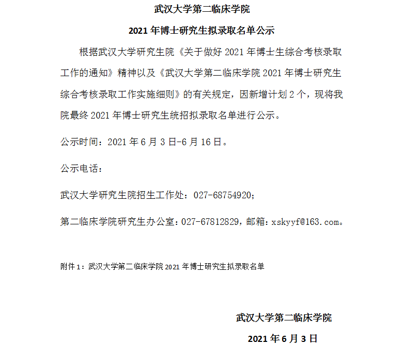 為幫助各位考生及時了解錄取結(jié)果,醫(yī)學(xué)教育網(wǎng)小編在武漢大學(xué)第二臨床學(xué)院研究生院的官網(wǎng)上查找到了“武漢大學(xué)第二臨床學(xué)院2021年博士研究生擬錄取名單”通知內(nèi)容如下,請同學(xué)仔細(xì)查看!有問題請及時聯(lián)系學(xué)校!