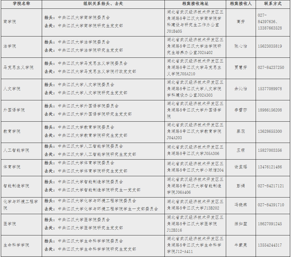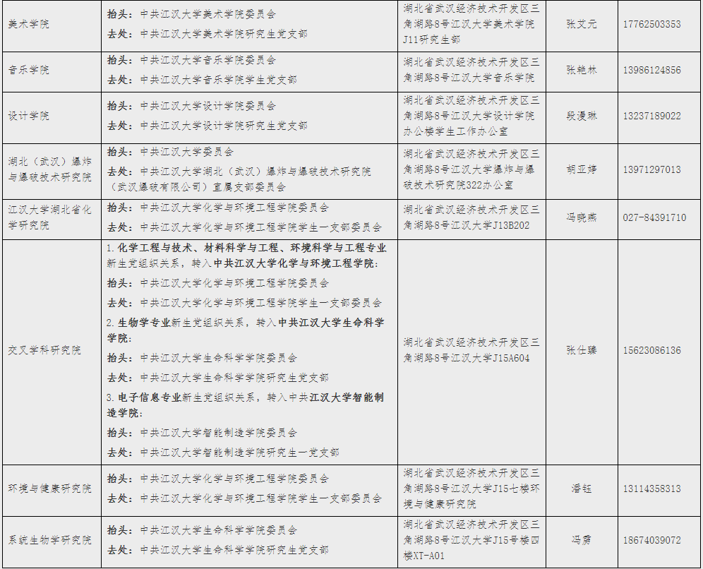 湖北省內(nèi)考生的黨組織關(guān)系,由考生所在黨組織通過“全國黨員管理信息系統(tǒng)”轉(zhuǎn)接,轉(zhuǎn)接原因備注“考取研究生”;湖北省外考生需開具正式的紙質(zhì)黨組織關(guān)系介紹信,介紹信在入學(xué)報(bào)到時(shí)交錄取學(xué)院。所有考生在轉(zhuǎn)接黨組織關(guān)系時(shí),抬頭統(tǒng)一寫“中共江漢大學(xué)××學(xué)院委員會(huì)”,去處寫“中共江漢大學(xué)XX學(xué)院××支部”,各學(xué)院黨委名稱及支部名稱附后。
