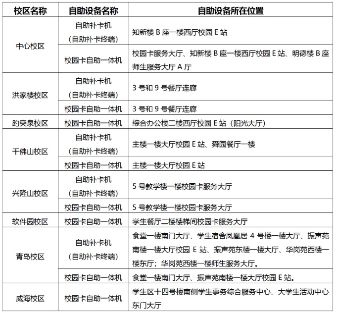 4.各校區(qū)自助補(bǔ)(領(lǐng))卡機(jī)、校園卡一體機(jī)安裝位置如下: