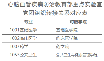3.錄取培養(yǎng)單位為“心腦血管疾病防治教育部重點實驗室”的考生,其黨、團組織關(guān)系根據(jù)錄取專業(yè)轉(zhuǎn)入對應(yīng)學院的黨、團組織(見附件3)。