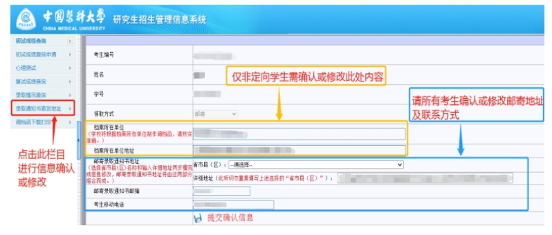 確認(rèn)方式:登錄中國(guó)醫(yī)科大學(xué)研究生招生管理信息系統(tǒng)確認(rèn)錄取通知書接收地址及聯(lián)系電話等信息,具體操作流程如下: