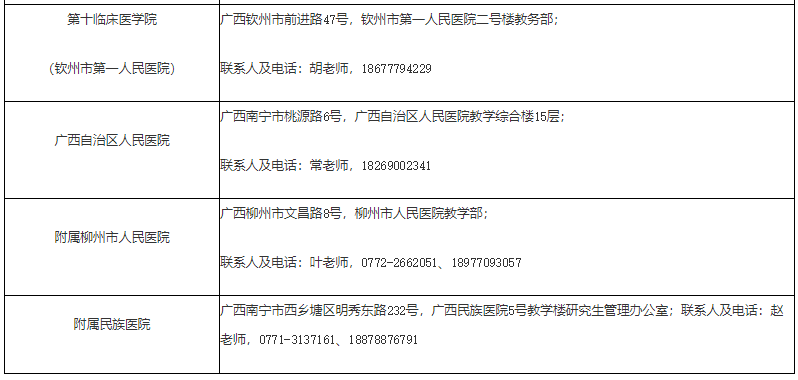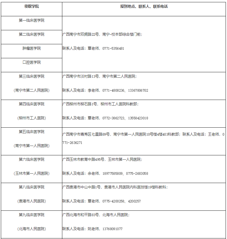 1.臨床醫(yī)學(xué)專業(yè)學(xué)位、口腔醫(yī)學(xué)專業(yè)學(xué)位碩士研究生報(bào)到地點(diǎn)及聯(lián)系方式:第一臨床醫(yī)學(xué)院、第二臨床醫(yī)學(xué)院、腫瘤醫(yī)學(xué)院、口腔醫(yī)學(xué)院新生在學(xué)校南寧-校本部報(bào)到,其它臨床醫(yī)學(xué)院及校外培養(yǎng)單位的新生分別到所屬單位報(bào)到,具體報(bào)到地點(diǎn)及聯(lián)系方式如下: