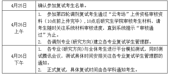 預(yù)計(jì)于2021年4月26日開(kāi)始第四輪調(diào)劑復(fù)試,請(qǐng)相關(guān)考生做好各項(xiàng)準(zhǔn)備工作,提前準(zhǔn)備資格審核材料,按時(shí)參加復(fù)試,未按時(shí)參加復(fù)試者視為自動(dòng)放棄復(fù)試資格。