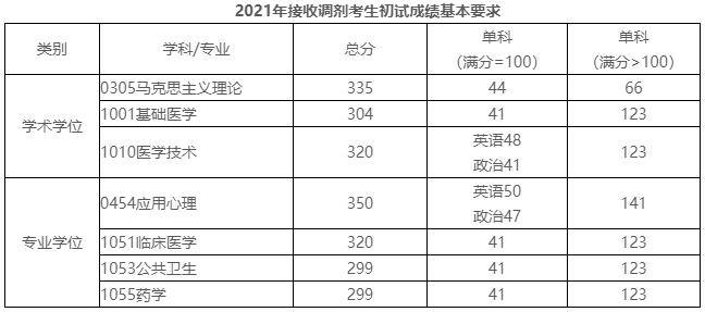 成都醫(yī)學院2021年各學科(專業(yè))接收調(diào)劑考生的初試成績基本要求如下: