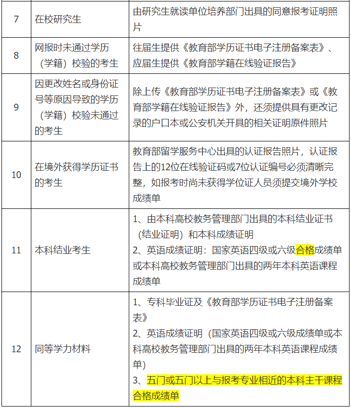 3、考生上傳材料,具體要求見下表。