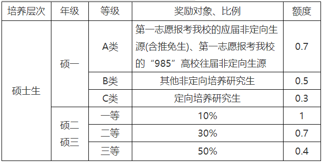 (一)研究生學業(yè)獎學金。學校按照規(guī)定統(tǒng)籌利用財政資金、學費收入、社會捐助等資金設立,主要用于資助研究生學費和生活補貼。第一學年,研究生獎學金的評定主要依據生源結構來確定。第二和第三學年則根據研究生的綜合表現(包括思想品德、學習成績、科研成果、社會服務、家庭經濟狀況等)評定。每年重新評定一次獎學金,發(fā)放年限不超過3年。學業(yè)獎學金標準與比例(暫行)見表。
