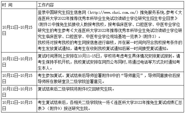 請(qǐng)閱讀我?!洞筮B醫(yī)科大學(xué)2022年推薦優(yōu)秀本科畢業(yè)生免試攻讀碩士學(xué)位研究生接收工作實(shí)施方案》(詳見(jiàn)附件1),并按照相關(guān)要求,做好復(fù)試準(zhǔn)備。