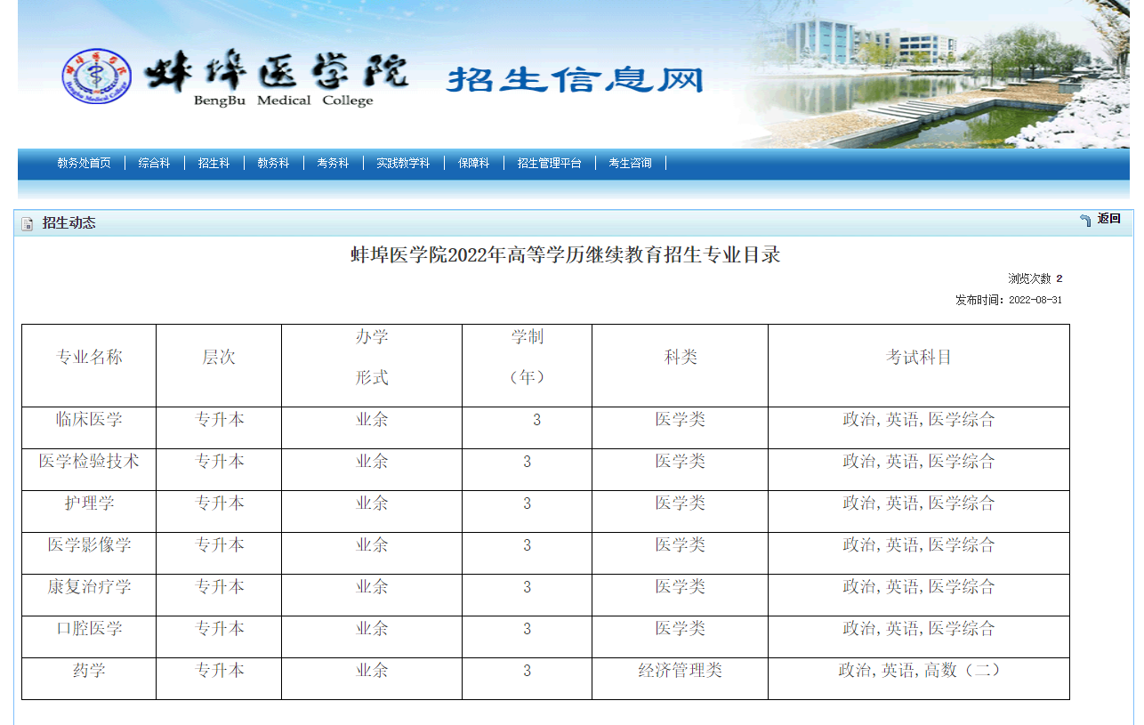 各位考研考友,請注意!蚌埠醫(yī)學(xué)院2022年高等學(xué)歷繼續(xù)教育招生專業(yè)目錄公布!為讓大家了解具體內(nèi)容,醫(yī)學(xué)教育網(wǎng)小編整理官方通知,分享如下: