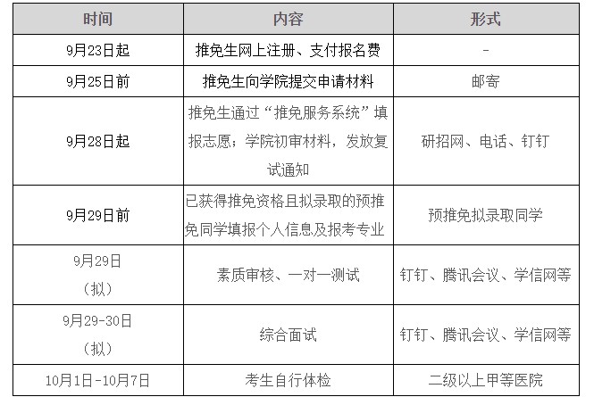 2、根據(jù)教育部推免工作安排,9月23日起,申請人通過教育部“全國推薦優(yōu)秀應(yīng)屆本科畢業(yè)生免試攻讀研究生信息公開暨管理服務(wù)系統(tǒng)”(以下簡稱“推免服務(wù)系統(tǒng)”,網(wǎng)址:)進(jìn)行注冊并填報個人資料信息。9月28日~10月20日,推免生通過“推免服務(wù)系統(tǒng)”填報志愿、接收并確認(rèn)招生單位的復(fù)試及待錄取通知,如開通時間有變化,以實(shí)際開通為準(zhǔn)。
