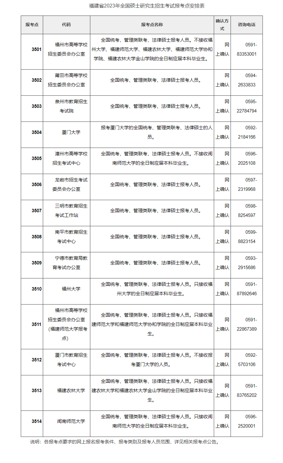 2.我省有關(guān)設(shè)區(qū)市及部分高校設(shè)有碩士研究生報(bào)考點(diǎn),各報(bào)考點(diǎn)接收?qǐng)?bào)考范圍詳見(jiàn)《福建省2023年全國(guó)碩士研究生招生考試報(bào)考點(diǎn)安排表》(詳見(jiàn)附表)。