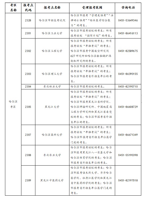 1.2023年黑龍江省碩士研究生報名共設(shè)8個考區(qū)35個報考點。各報考點的行政區(qū)域劃分和受理報考范圍均有嚴(yán)格限制。考生必須按限定條件選擇報考點報名。