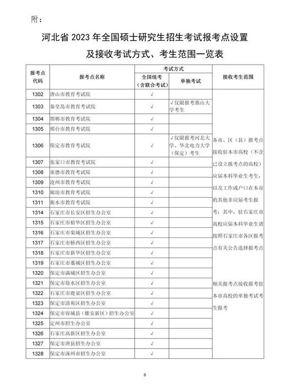 河北省2023年全國碩士研究生招生考試報考點設(shè)置及接收考試方式、考生范圍一覽表
