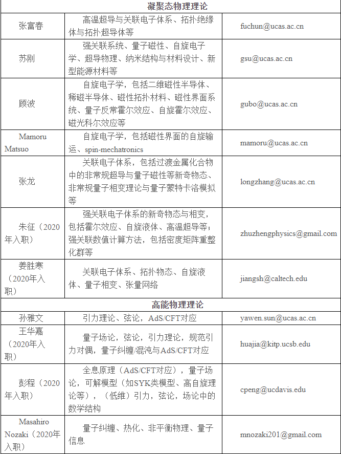 卡弗里所歡迎有志于物理基礎(chǔ)理論研究工作、具有扎實(shí)理論基礎(chǔ)的優(yōu)秀本科生來(lái)我所攻讀博士學(xué)位。有意向的同學(xué)請(qǐng)將個(gè)人簡(jiǎn)歷、自我陳述、本科期間主干課程成績(jī)及院系排名發(fā)送給張科研老師(zhangkeyan@ucas.ac.cn),或直接聯(lián)系感興趣的導(dǎo)師(郵箱請(qǐng)見(jiàn)下表)。此外,請(qǐng)聯(lián)系至少一位老師將推薦信發(fā)送到上述地址。申請(qǐng)時(shí)間原則上不晚于2020年6月15日。我們將擇優(yōu)選拔部分申請(qǐng)人進(jìn)行面試。面試時(shí)間及具體安排,將視疫情防控情況另行通知。