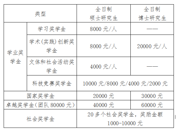 研究生獎學金包括學業(yè)獎學金、國家獎學金、卓越獎學金、專項獎學金四類,各培養(yǎng)層次的全日制研究生可申請相應類別獎學金。獎勵標準如下: