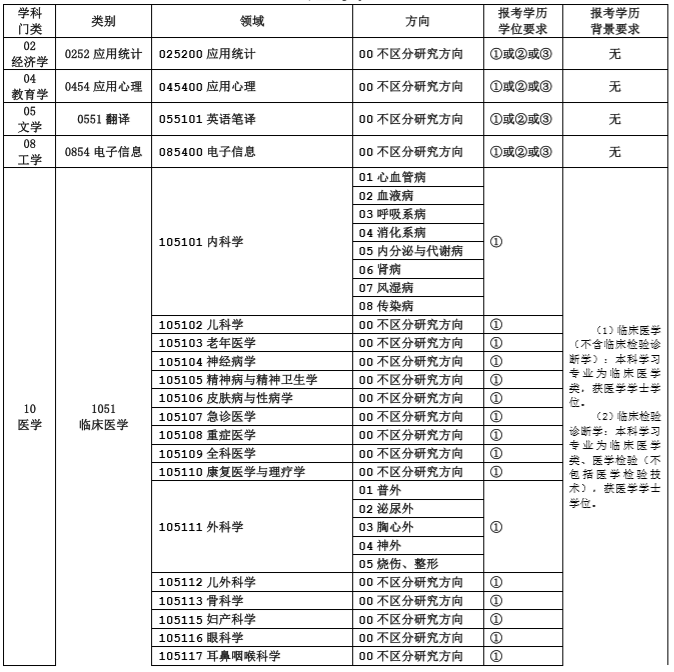 本科學(xué)習(xí)專(zhuān)業(yè)為醫(yī)學(xué)技術(shù)類(lèi)(口腔醫(yī)學(xué)技術(shù)除外)、基礎(chǔ)醫(yī)學(xué)類(lèi)、臨床醫(yī)學(xué)類(lèi)。須獲得學(xué)士學(xué)位。