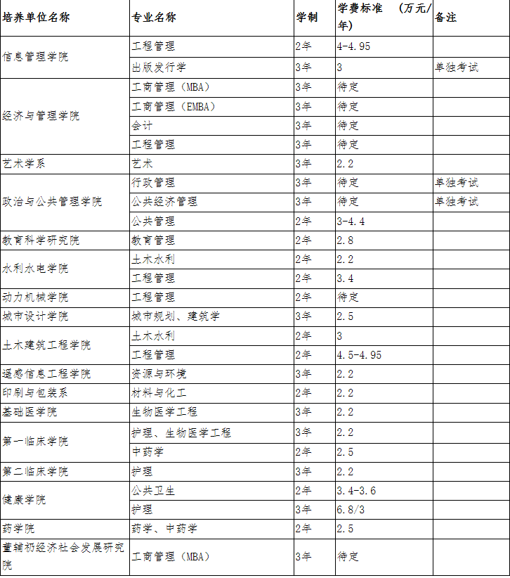 根據國家有關規(guī)定,我校全日制學術學位研究生的學費標準為:8000元/人·年;全日制專業(yè)學位研究生的學費標準為:13000元/人·年。非全日制研究生的學費標準見下表(陸續(xù)更新),最終學費以湖北省物價部門核準的學費標準為準。