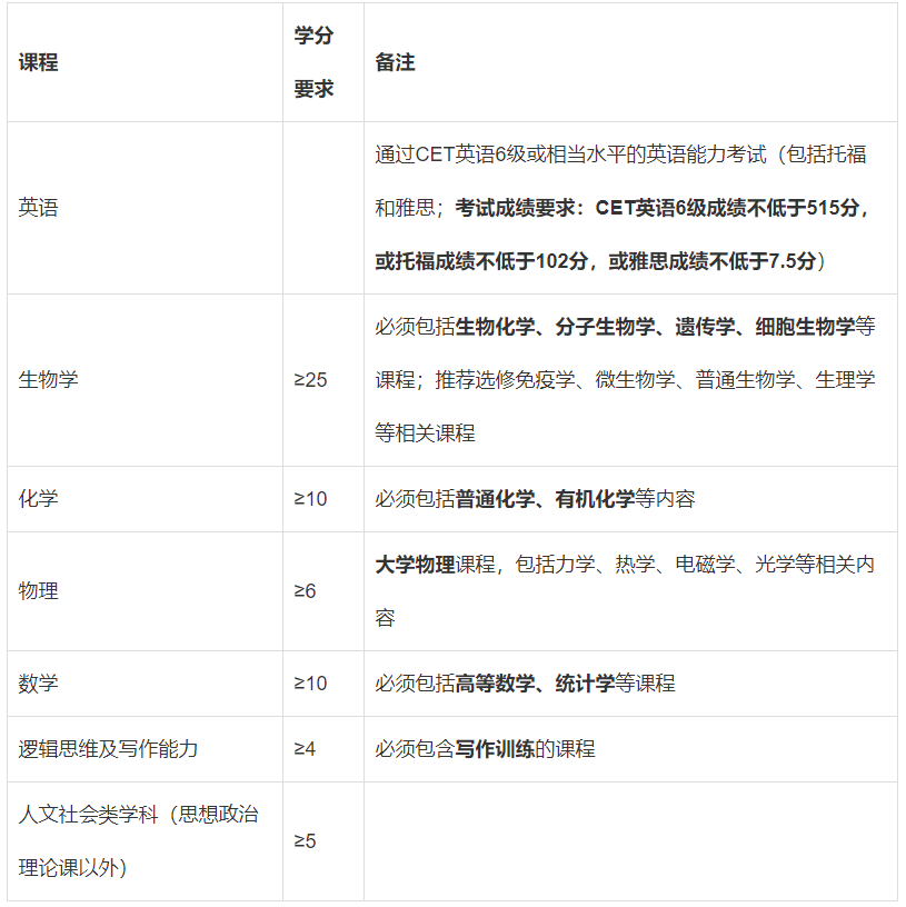 學(xué)生在本科期間修讀的生物、化學(xué)、物理、數(shù)學(xué)、邏輯思維及寫作能力、人文社會類學(xué)科課程必須達(dá)到下表中每項的要求,同時總學(xué)分需要達(dá)到≥70。