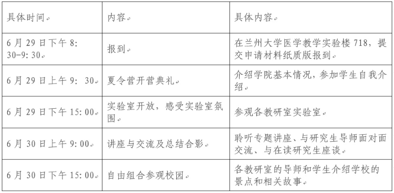 即日起通過提交材料和添加qq群(群號:1002612313)報名,申請截止時間為6月25日。電子版申請材料按順序編號壓縮后以“姓名+畢業(yè)學(xué)校+暑期夏令營”命名發(fā)送到郵箱jcyxy@lzu.edu.cn,郵件主題:姓名+畢業(yè)學(xué)校+暑期夏令營。最終確定參加人員以網(wǎng)站發(fā)布的最終名單為準(zhǔn)。