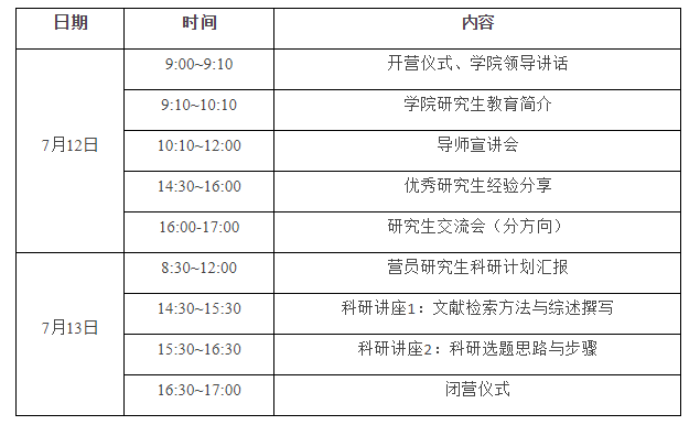 夏令營將于7月12-13日進(jìn)行,具體議程見下表。