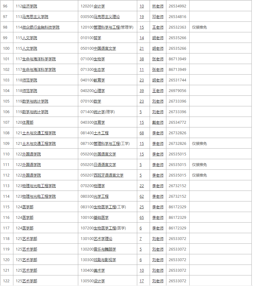 表中擬招人數(shù)僅供參考,最后錄取以教育部實(shí)際下達(dá)招生人數(shù)為準(zhǔn)。除非全日制的工商管理、公共管理、教育管理不招收推免生外,其他專業(yè)均招收推免生。擬招人數(shù)含推免人數(shù),我校將在統(tǒng)考報(bào)名結(jié)束前公布實(shí)際接收推免數(shù)及可用于統(tǒng)考指標(biāo)。
