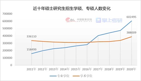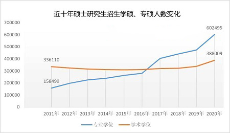 《報(bào)告》提出,碩士研究生招生總?cè)藬?shù)中,專碩招生人數(shù)增長明顯。從2011年的15.8萬增長到2020年的60.2萬,專碩招生人數(shù)增長近4倍。2017年起,專碩招生人數(shù)首次超過學(xué)碩,并持續(xù)高速增長。