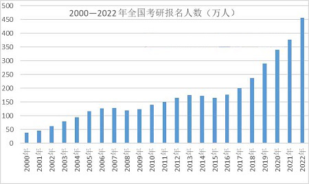 2022年全國碩士研究生報(bào)名人數(shù)457萬,比2021年增長80萬,增幅為21%。從近年數(shù)據(jù)來看,2020年考研報(bào)名人數(shù)比2019年增加了51萬人,2021年比2020年增加了36萬人。自2016年起,我國碩士研究生報(bào)考人數(shù)在高位上保持高增長趨勢(shì)。2015—2022年,7年平均增長15.8%。