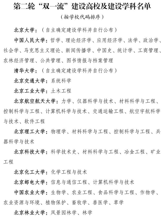 關于公布第二輪“雙一流”建設高校及